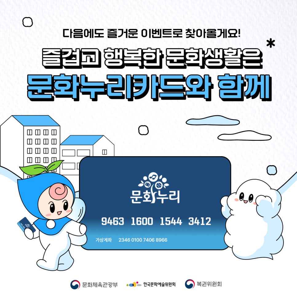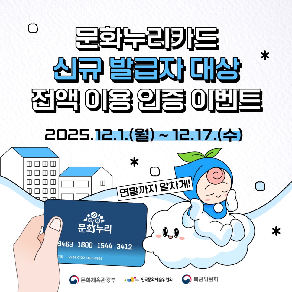 | 제목 | [이벤트] 2025년 문화누리카드 신규발급자 대상 전액 이용 인증 이벤트(25.12.1.~12.17) | ||||
